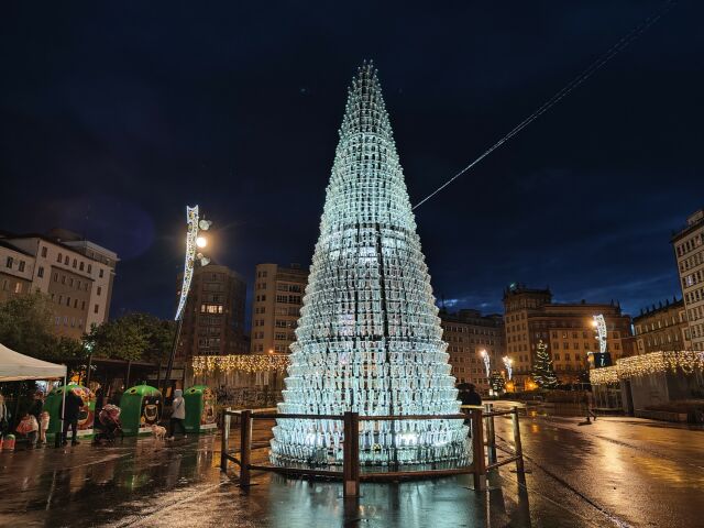 A 10-meter-high tree made from 2,000 glass bottles lights up the square this year.