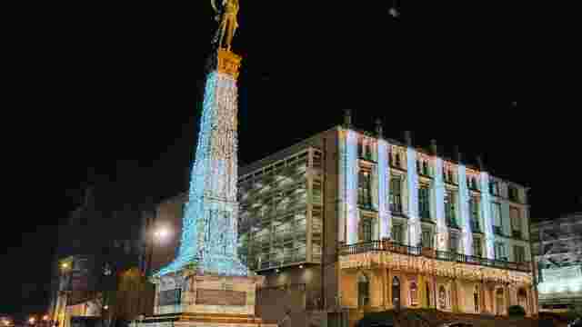 El majestuoso ayuntamiento con su fachada alumbrada con los colores de la ciudad, un encantador mercado navideño y el bonito árbol iluminado