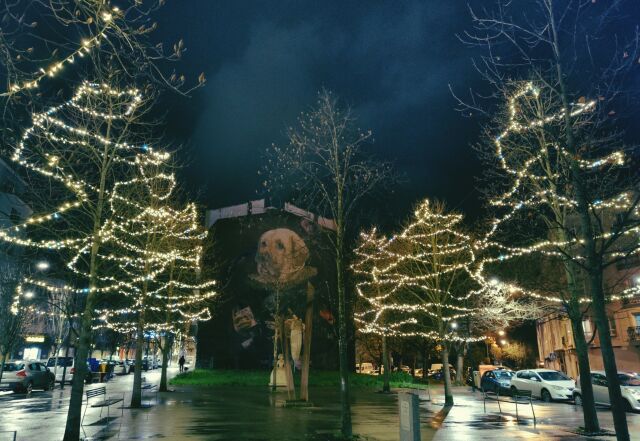 En la plaza Fernando Miramontes, los árboles lucen iluminados creando un espacio único con la estatua y una de las fachadas de las meninas como fondo.