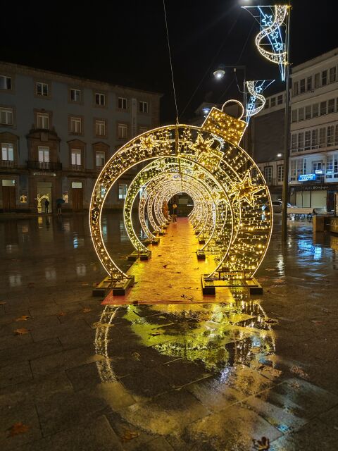 Un ambiente festivo coa estatua do marqués baixo un manto de luces e divertidos elementos fotográficos, ideal para capturar momentos únicos do Nadal.